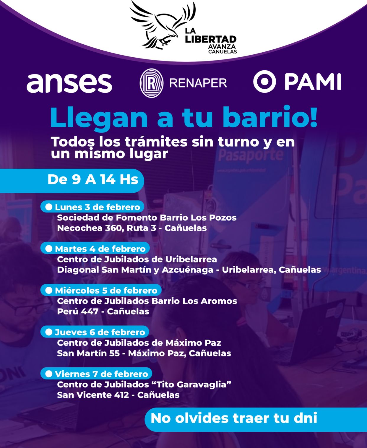 Mañana se repetirá el operativo en el barrio Los Aromos, en el Centro de Jubilados de la calle Perú al 447, y el jueves será el turno de Máximo Paz, en San Martín 55. El plan finalizará el viernes, en la ciudad, en San Vicente 412. En el afiche, se pide concurrir con DNI.